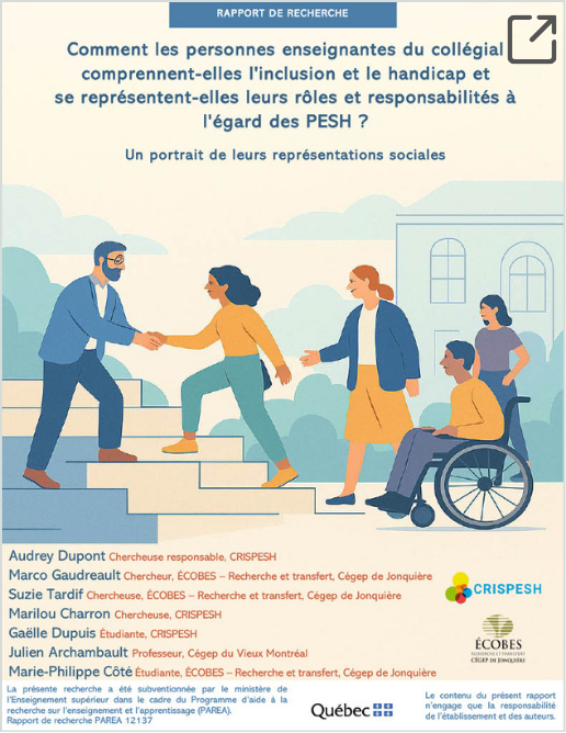 Dupont, A.; Gaudreault, M.; Tardif, S.; Charron, M.; Dupuis, G.; Archambault, J. et Côté, M.-P. (2025). Comment les personnes enseignantes du collégial comprennent-elles l’inclusion et le handicap et se représentent-elles leurs rôles et responsabilités à l’égard des PESH ? : un portrait de leurs représentations sociales. CRISPESH, ÉCOBES, Cégep du Vieux Montréal. https://eduq.info/xmlui/handle/11515/40043