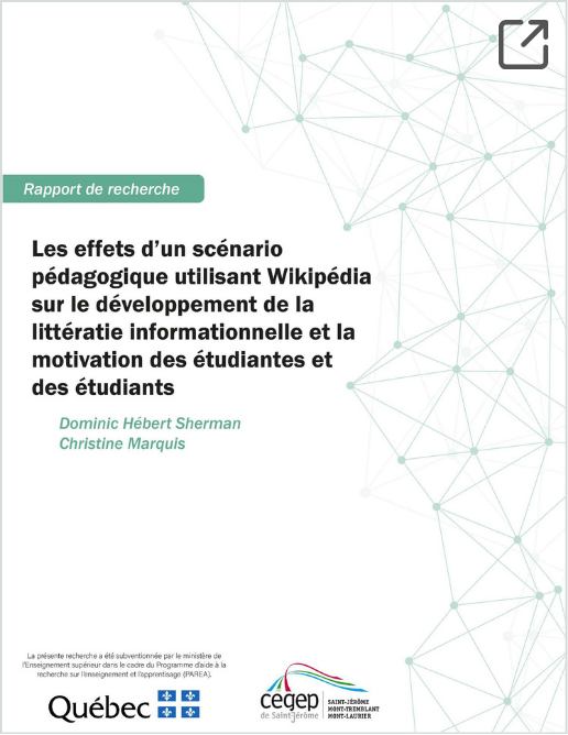 Hébert Sherman, D. et Marquis, C. (2025). Les effets d’un scénario pédagogique utilisant Wikipédia sur le développement de la littératie informationnelle et la motivation des étudiantes et étudiants. Cégep de Saint-Jérôme https://eduq.info/xmlui/handle/11515/39740