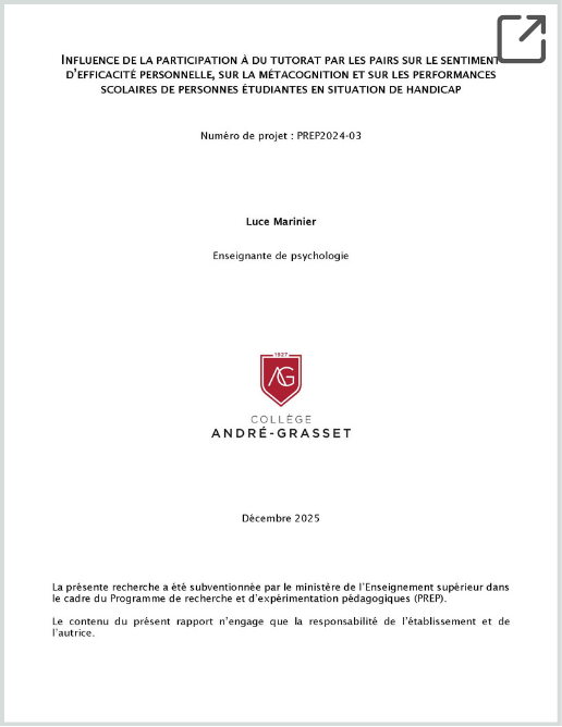 Marinier, L. (2025). Influence de la participation à du tutorat par les pairs sur le sentiment d’efficacité personnelle, sur la métacognition et sur les performances scolaires de personnes étudiantes en situation de handicap. Collège André-Grasset. https://eduq.info/xmlui/handle/11515/40164