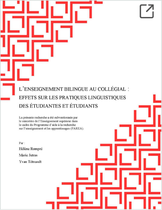 Rompré, H.; Jutras, M. et Tétreault, Y. (2025). L’enseignement bilingue au collégial : effets sur les pratiques linguistiques des étudiantes et étudiants. Collégial international Sainte-Anne. https://eduq.info/xmlui/handle/11515/40164